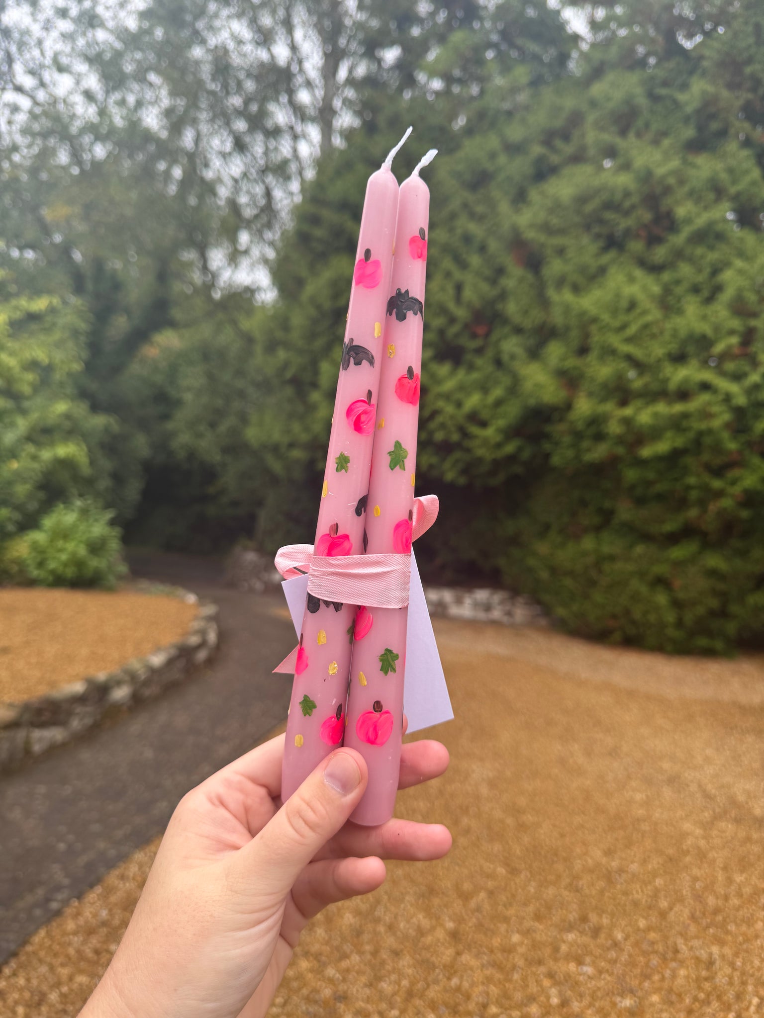 Hand Painted Candle Stick Duo “Bats and Pink Pumpkins”