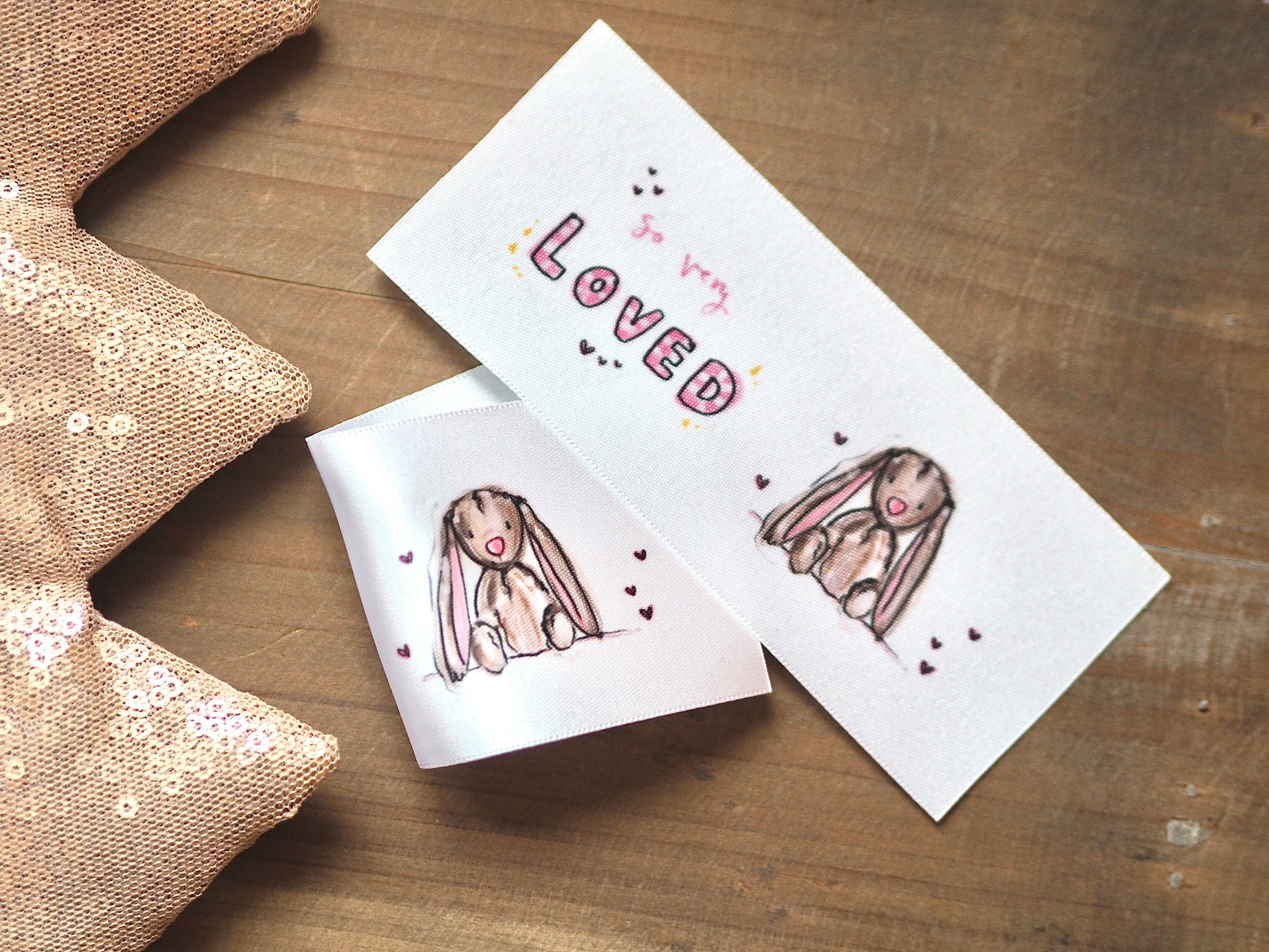 This label shows the loved wording on one side and two bunnies on the reverse side. Comes as a pair of labels and they can be sewn directly onto clothing or accessories. I love this item!