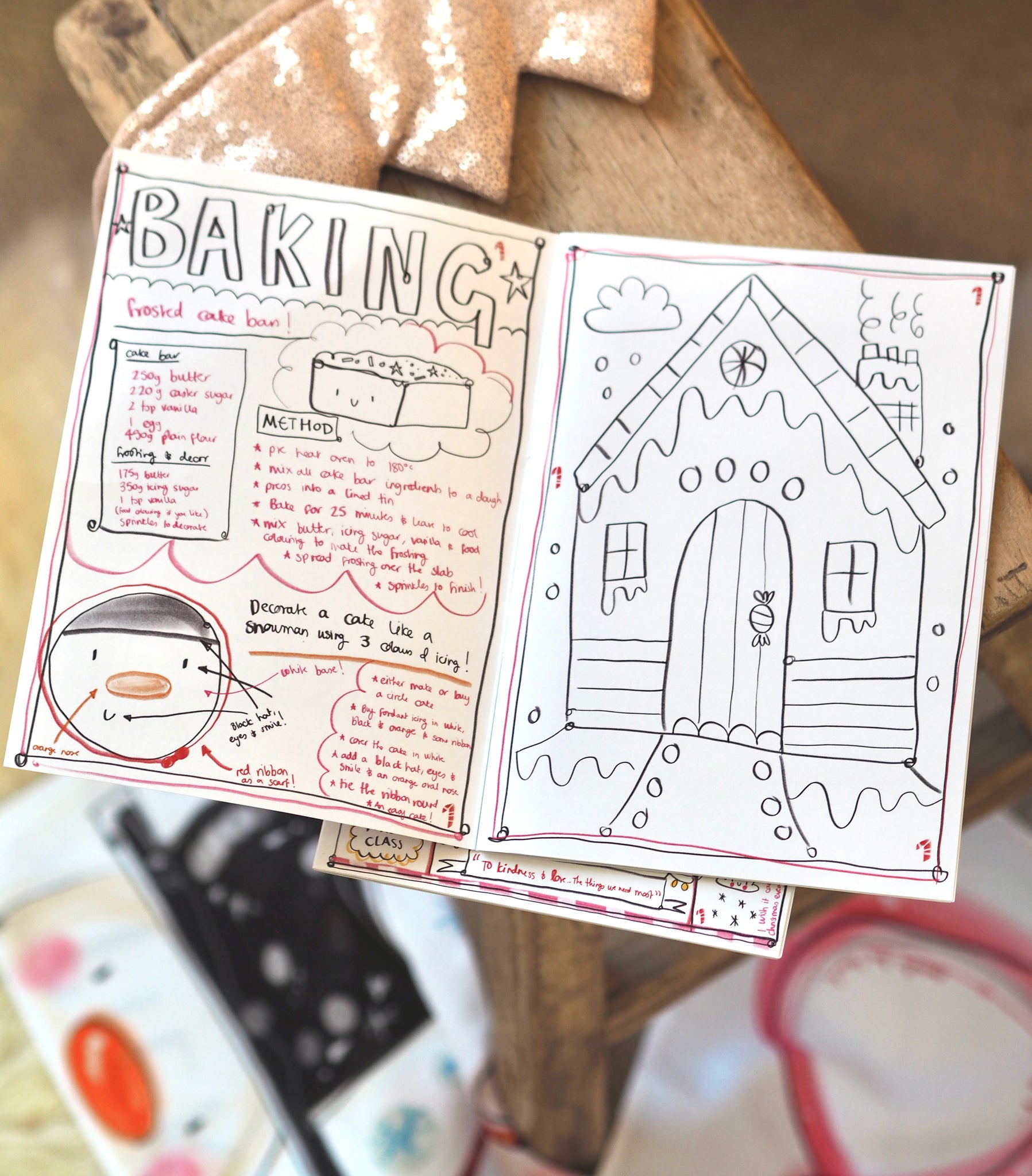 12 pages in total, its jam packed with baking, games, people of inspiration, poems, quotes and illustrations. But with a twist, the 6 inside pages are black and white, so the WHOLE book is a colouring book as well as a super fun magazine!