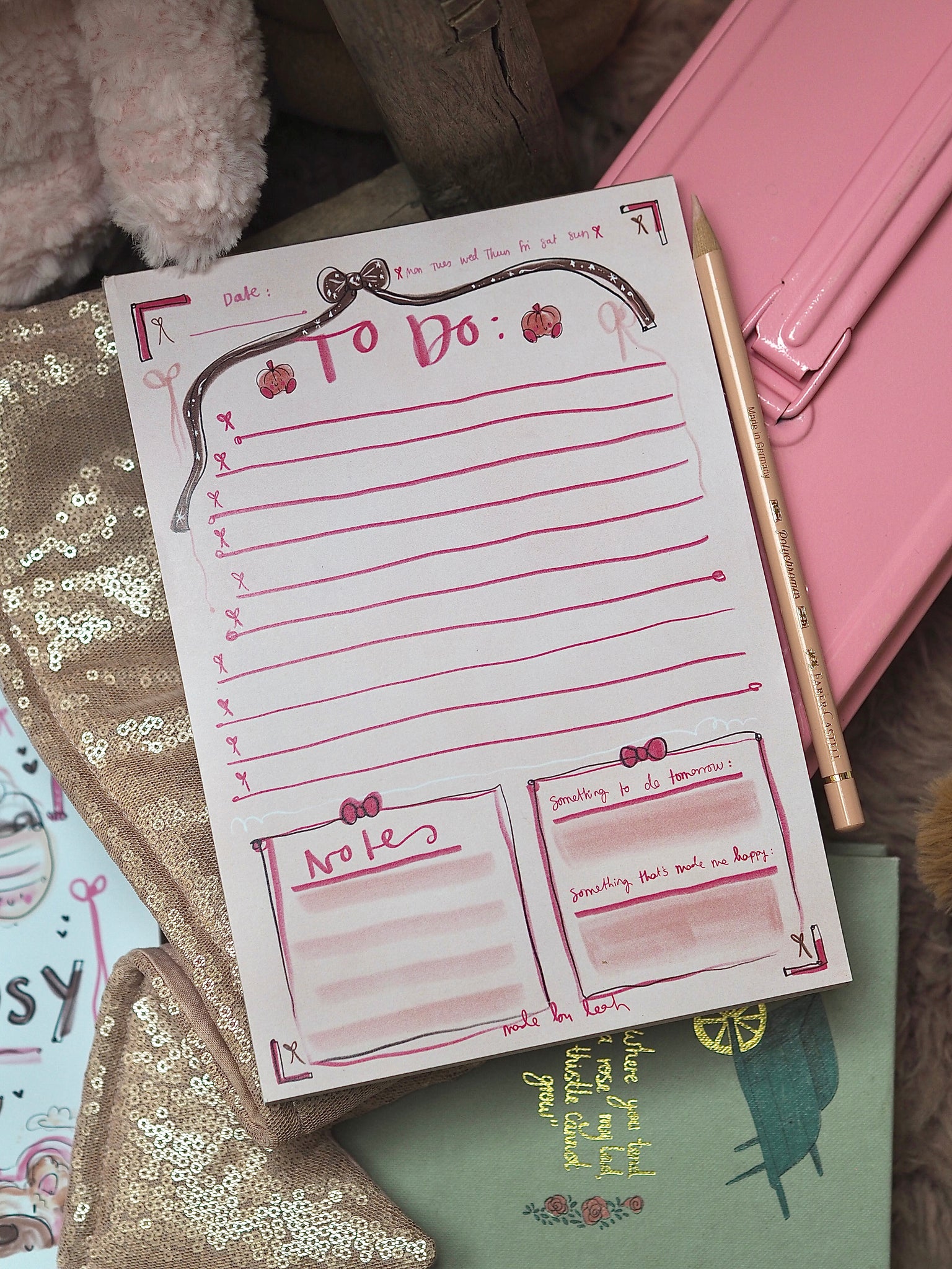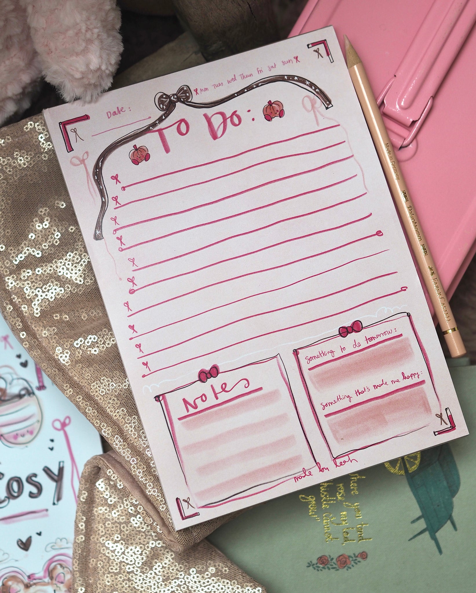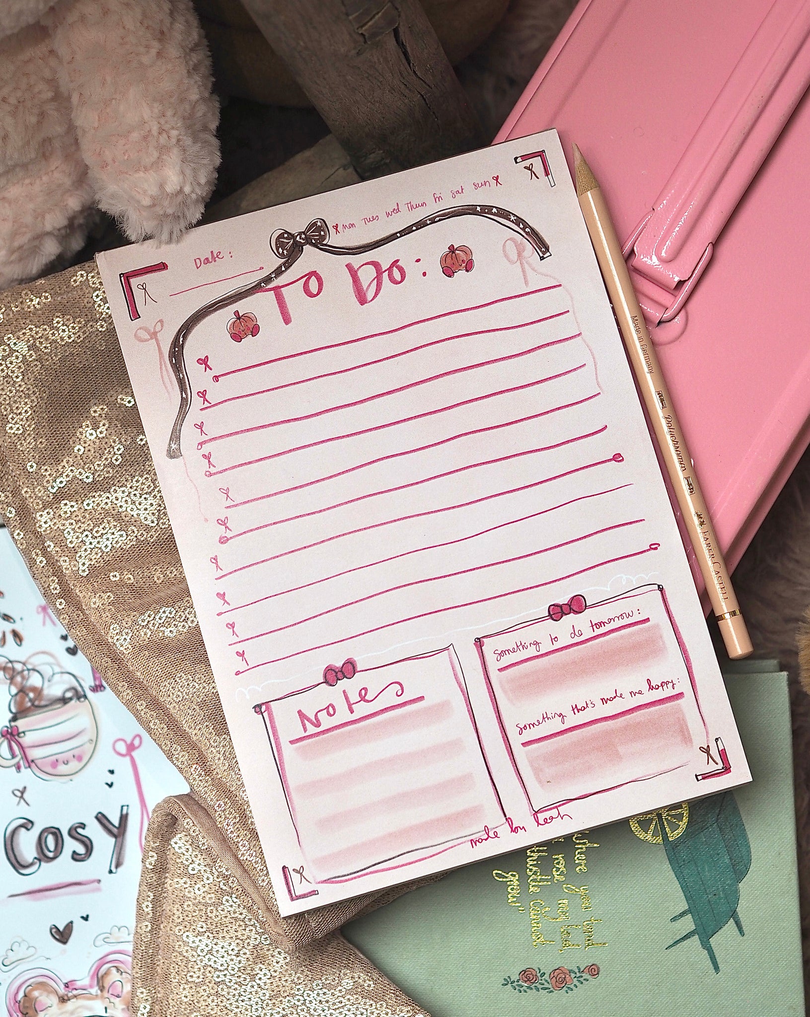 The glue binding is on the top side and each page shows to do list cosy girly doodles with space to write a to do list.