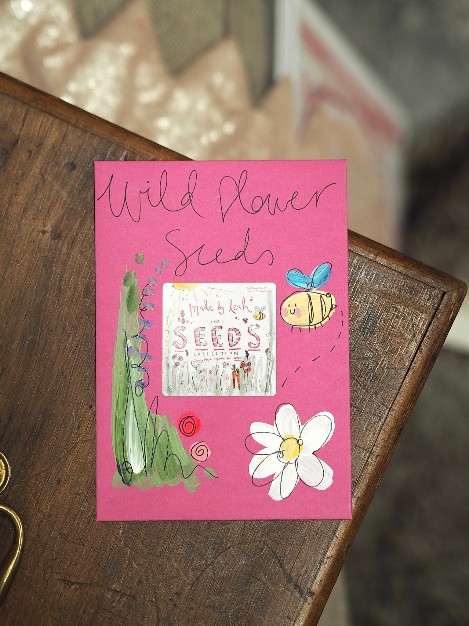 A 6x4 fancy envelope with a choice of brown or pink, finished with a made by Leah sticker and full of wild flower seed mix to scatter.
